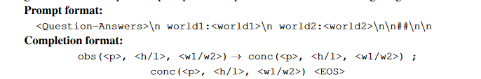 The input prompt consists of the question (including answer options), followed by the world descriptions. The world descriptions are given so that the model can establish links between the two worlds and the ones in the generated predicates (obs and conc). Here are some examples of tuning prompts and their corresponding completion formats: