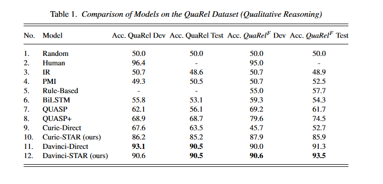 Davinci-STAR outperforms the state-of-the-art on QuaRel, and it also outperforms Davinci-Direct on three of the four datasets compared. Table 1 also shows the dramatic increase in accuracy of the Curie model on all datasets. This leads us to conclude that while Davinci has some reasoning ability, Curie does not.