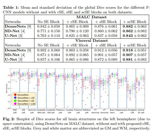 The following results as provided in the paper showcase the efficacy of the scSE block used in different F-CNN architectures like U-Net, SD-Net and DenseNets on the MALC and Visceral Datasets for Medical Image Segmentation.