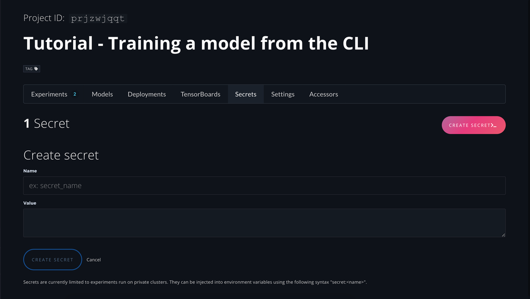 Secrets are often used to store API keys, S3 credentials, SSH keys, or any other secure text needed to run your machine learning workloads. They are especially for collaborative teams in need of secure methods of credentialing outside resources for use in a project or experiment.