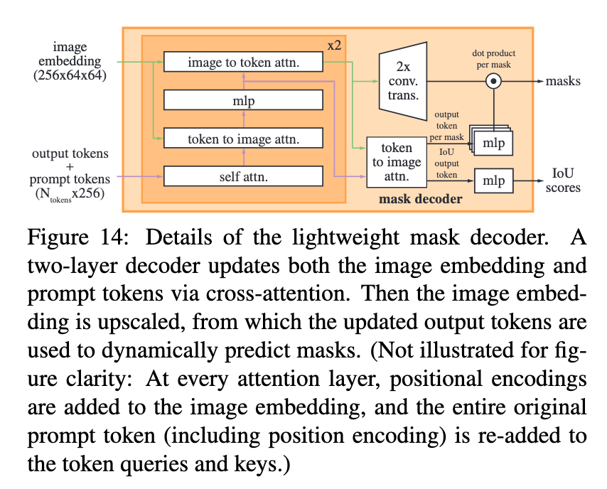 The novel part of this encoder-decoder flow is the lightweight mask decoder. This two layer component works to update the image embedding and prompt tokens with cross-attention. The embedding is then upscaled so that the updated output tokens can be used to dynamically predict masks. At every attention layer, the positional encodings are added to the image embedding, and the original prompt token with the position encoding is re-added to the token queries and keys. (source)