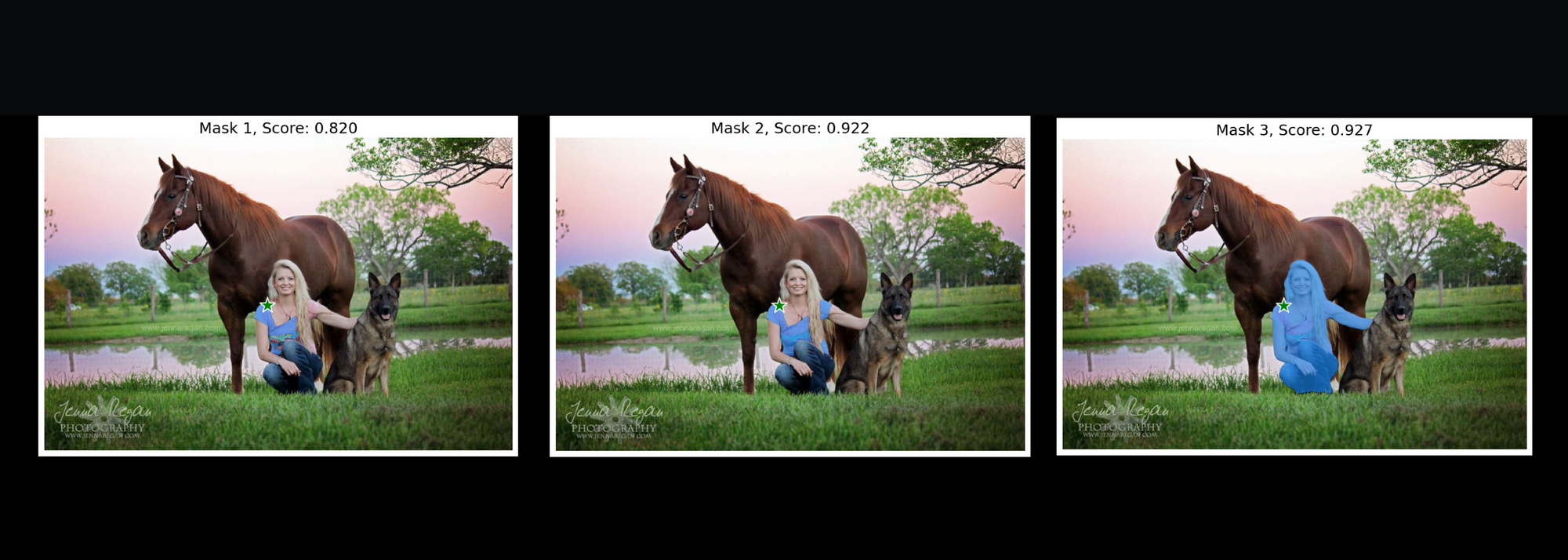 The first mask tries to mask the shirt, the second mostly successfully masks the shirt, and the third mask (the most high probability) marks the entire woman. This zero-shot demonstration of the model's segmentation capabilities show's its incredible utility for image segmentation and object detection tasks.