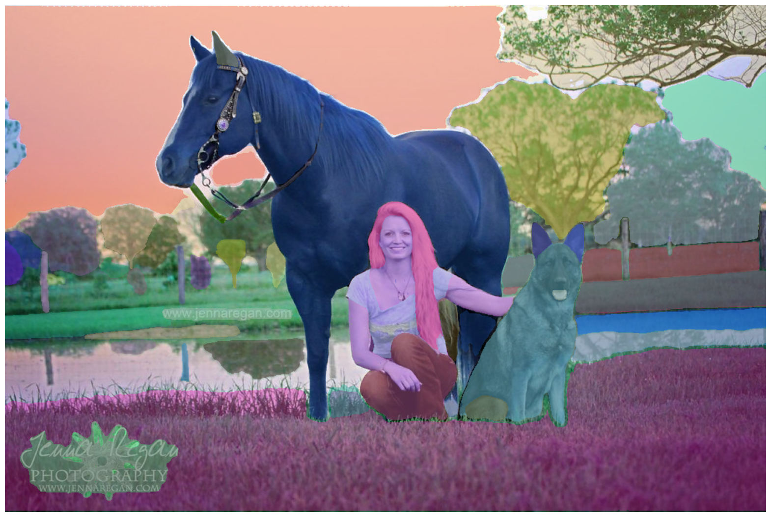 As we can see, each major object has been successfully separated and overlaid with a masking layer. The model attempts to go further than identifying the objects alone, and many of the objects are actually overlaying other masks. For example, the dog's ears are both clearly labeled as the same sort of ears, as shown by the coloration. They are a part of the total dog segmentation mask, but are each themselves represented by their own mask objects.