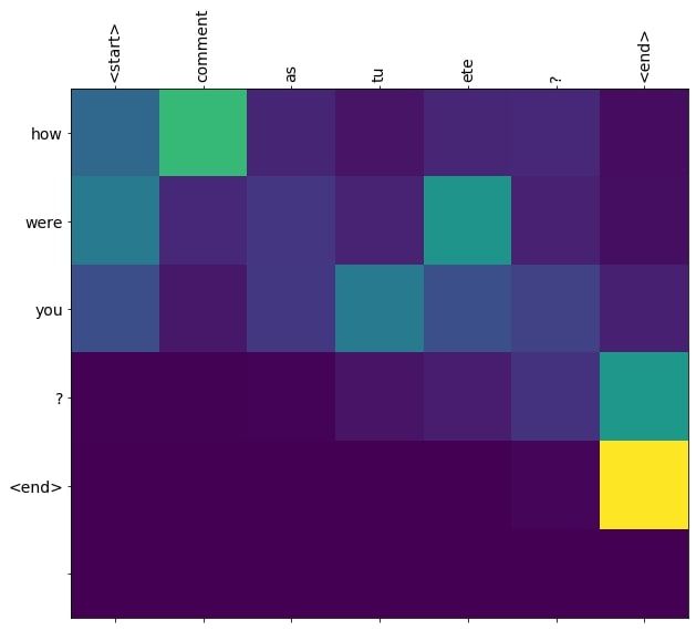 plot_attention(attention_plot, sentence.split(' '), result.split(' '))Restore the saved checkpoint to the model.