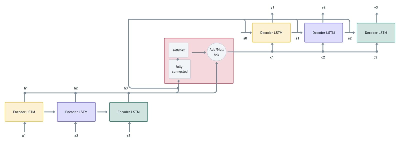 - Firstly, the input sequence $x_1, x_2, x_3$ is given to the encoder LSTM. The vectors $h_1, h_2, h_3$ are computed by the encoders from the given input sequence. These vectors are the inputs given to the attention mechanism. This is followed by the decoder inputting the first state vector $s_0$, which is also given as an input to the attention mechanism. We now have $s_0$ and $h_1, h_2, h_3$ as inputs.