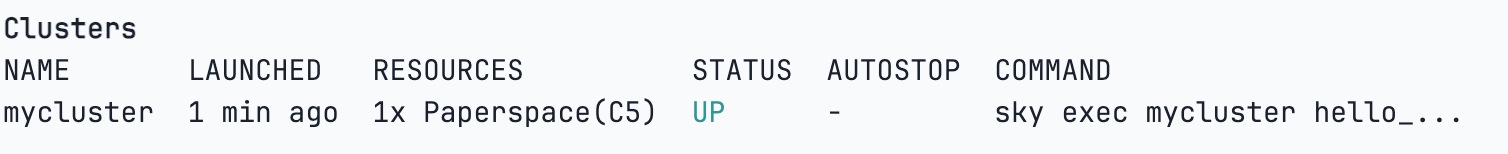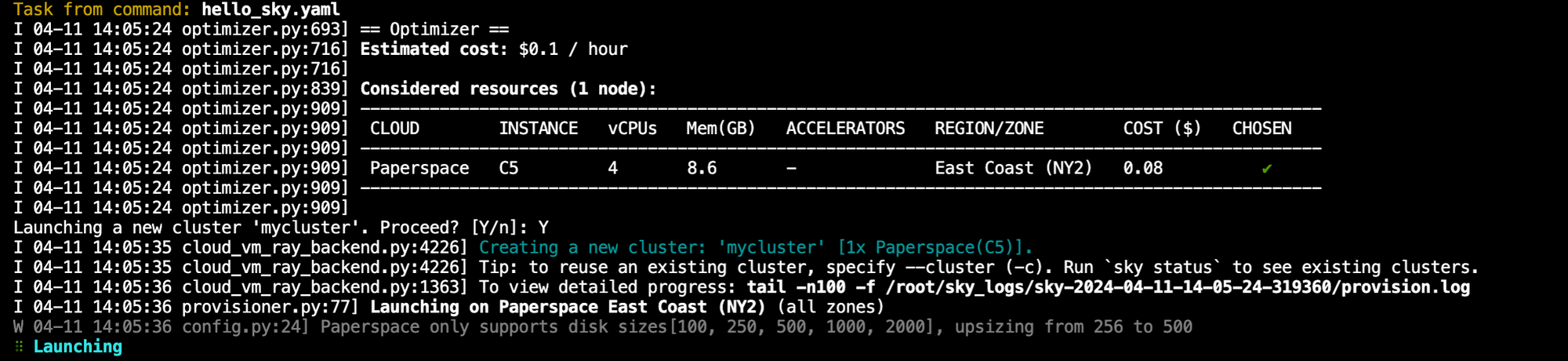sky launch -c mycluster hello_sky.yamlYou should see the available instances, the details of the instance along with the estimated cost.
