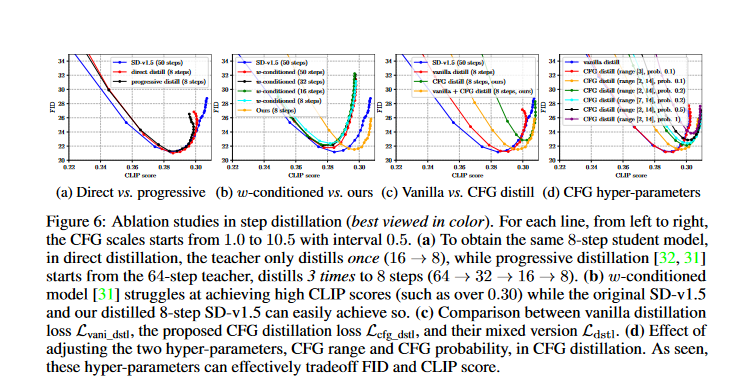 - Part (d) shows how to optimize the two settings for CFG distillation - CFG range and CFG probability . It looks like higher CFG probability and bigger CFG range increases the CFG loss's impact, that lead to better CLIP score but makes the FID worse. So these settings give a good way to balance FID and CLIP score during training.