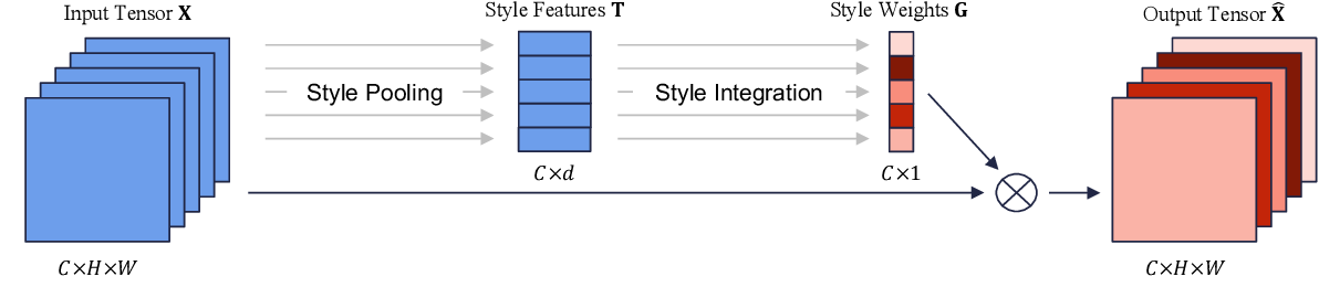 Mathematically, given the output of the style pooling which is denoted as the style representation $\textbf{T} \in \mathbb{R}^{N \ast C \ast 2}$, the style integration operator encodes channels using learnable parameters $\textbf{W} \in \mathbb{R}^{C \ast 2}$: