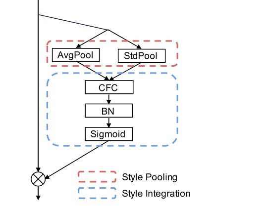 The resultant $t_{nc} \in \mathbb{R}^{2}$, denoted as the style vector, serves as the summarization of the style information for each image in batch $n$ and channel $c$. The $\mu_{nc}$ is popularly referred to as Global Average Pooling (GAP) and is also used as the preferred form of compression in other standard attention mechanisms, like Squeeze-and-Excitation (SENets) and Convolutional Block Attention Module (CBAM). The authors do investigate other forms of style pooling, like computing the max pooling which is used along with average pooling in CBAM, in the appendix (this is discussed later in the results section of this article). In the context of style disentanglement, often the correlation between the channels are computed, however, the focus of the authors in this case was to focus on the channel-wise statistics for efficiency and conceptual clarity since computing the channel correlation matrix has a $C \ast C$ computational budget requirement.