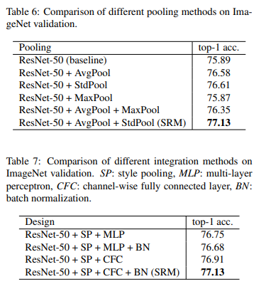 In the following sections we will analyze both components of SRM, namely Style Pooling and Style Integration. We will conclude by revisiting Squeeze-and-Excitation Networks and observe the differentiating points between SRM and SE channel attention.