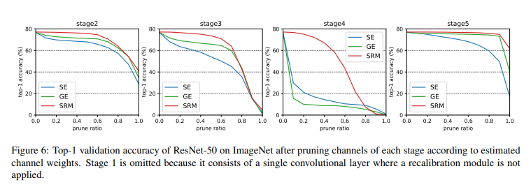 Finally, to validate that SRM yields relevant channel weights, the authors used SRM's channel weights to prune the model and observed the sparse (pruned) model's performance. As shown in the graph below, SRM-based pruned networks demonstrate improved performance compared to baseline: