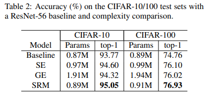 SRM was also able to maintain a comfortable lead over Vanilla, SE, and GE (Gather Excite) variants on CIFAR-10 and CIFAR-100 image classification benchmarks, as shown in the table below: