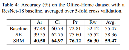 SRM also demonstrated consistently better performance than baseline and SE-based ResNet-18 on multi-domain classification on the Office Home dataset on average over 5-fold cross-validation. Results are shown in the table below: