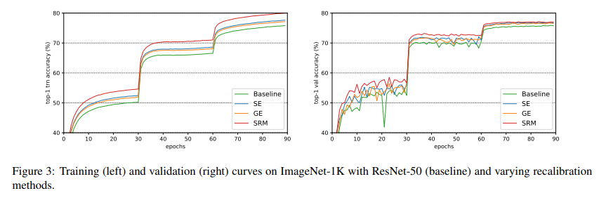 As shown in the above table, SRM substantially outperforms vanilla, GE, and SE-based networks on the ImageNet classification task while being cheap in terms of parametric overhead. The training curves for the ResNet-50 based models are shown in the graph below: