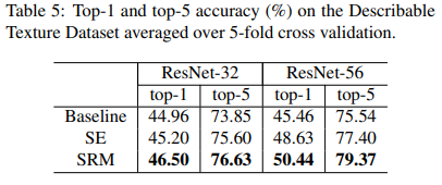 Continuing with the strong performances demonstrated in the benchmarks discussed above, SRM improved the scores of ResNet-32 and ResNet-56 models over the baseline and SE variants on the texture classification benchmark on the Describable Texture Dataset averaged over 5-fold cross-validation, as shown below: