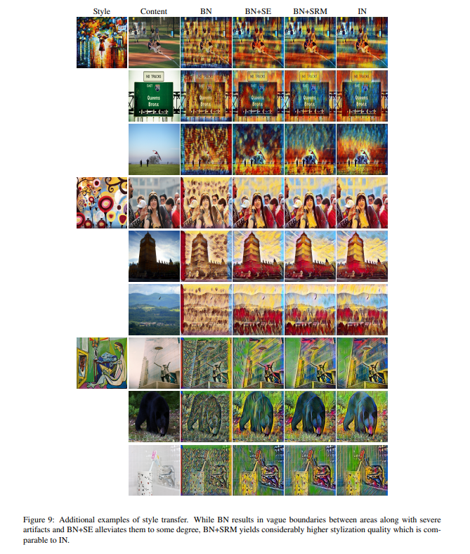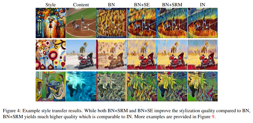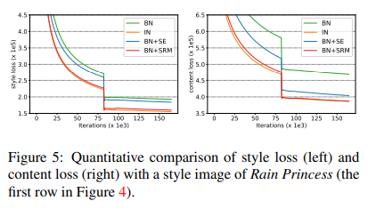 The authors finally explored the performance of SRM on the task of style transfer using the MS-COCO dataset. The training graph and sample outputs for quantitative analysis are presented below: