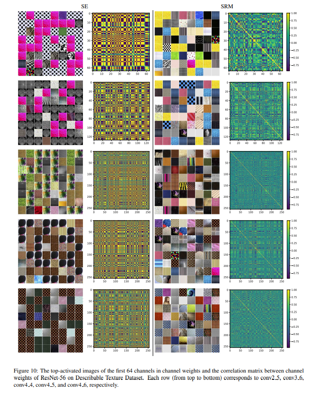 To understand the representational differences between SE and SRM, the authors visualized the features learned by both SRM and SE through the images which lead to the highest channel weights. They did this by using an SE and SRM based ResNet-56 trained on the DTD dataset. As shown in the figure below, SE results in highly overlapping images across channels, while SRM demonstrates a higher diversity in top-activated images, which implies that SRM allows a lower correlation between channel weights as compared to SE. The authors further imply that the difference between the representative expressive powers of SE and SRM can be a future area of research. Although the distinction is significant, it didn't necessarily provide complete clarity on the impact of the different modules in SRM compared to that of SE, because of the extreme similarity between the two structures in terms of design.