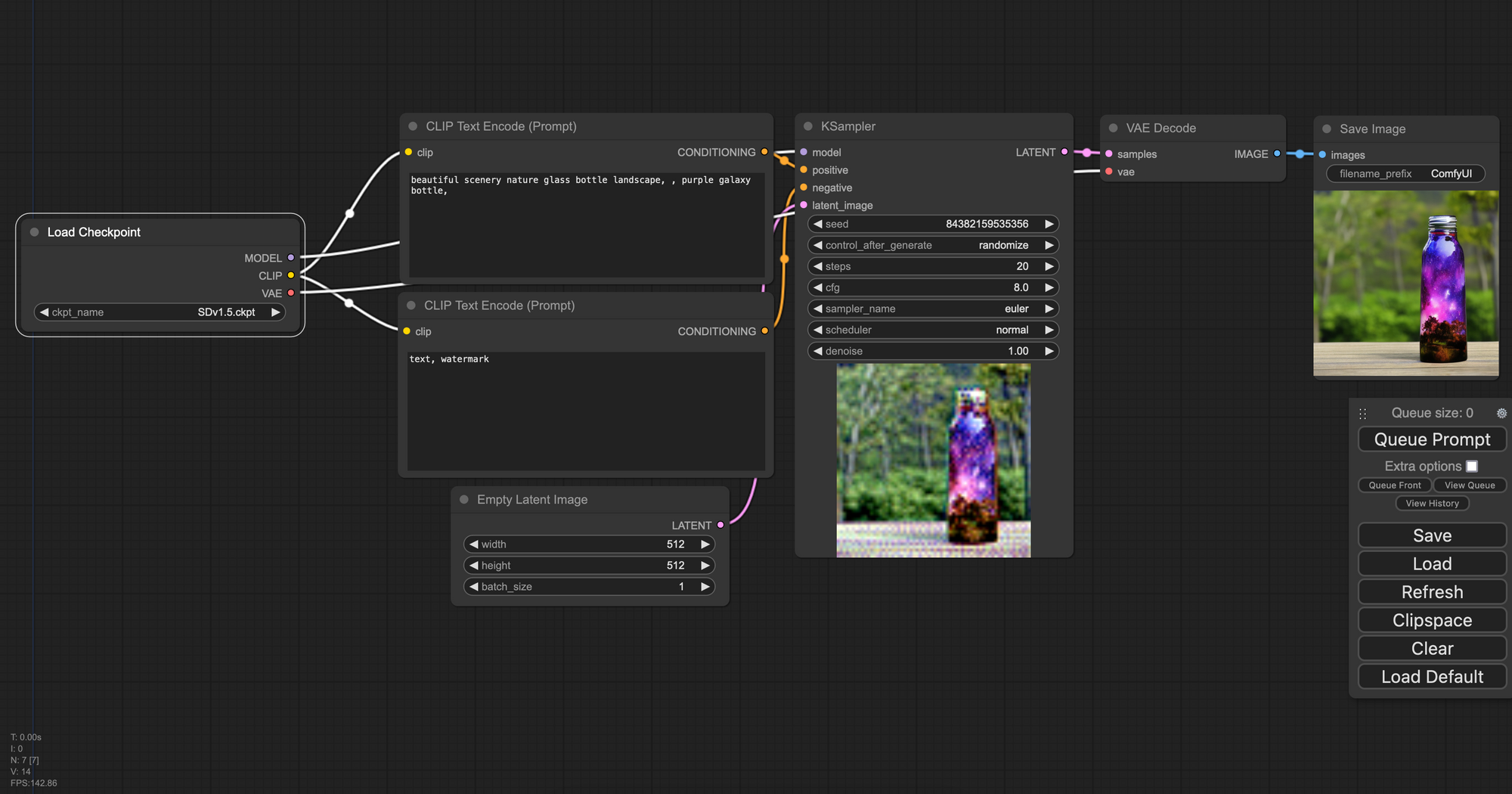 When generating with ComfyUI, nearly all the functionalities we indicated for working with the HuggingFace package are easily accessible and changeable without any code. Below is an example workflow, the default available on the Notebook tutorial.
