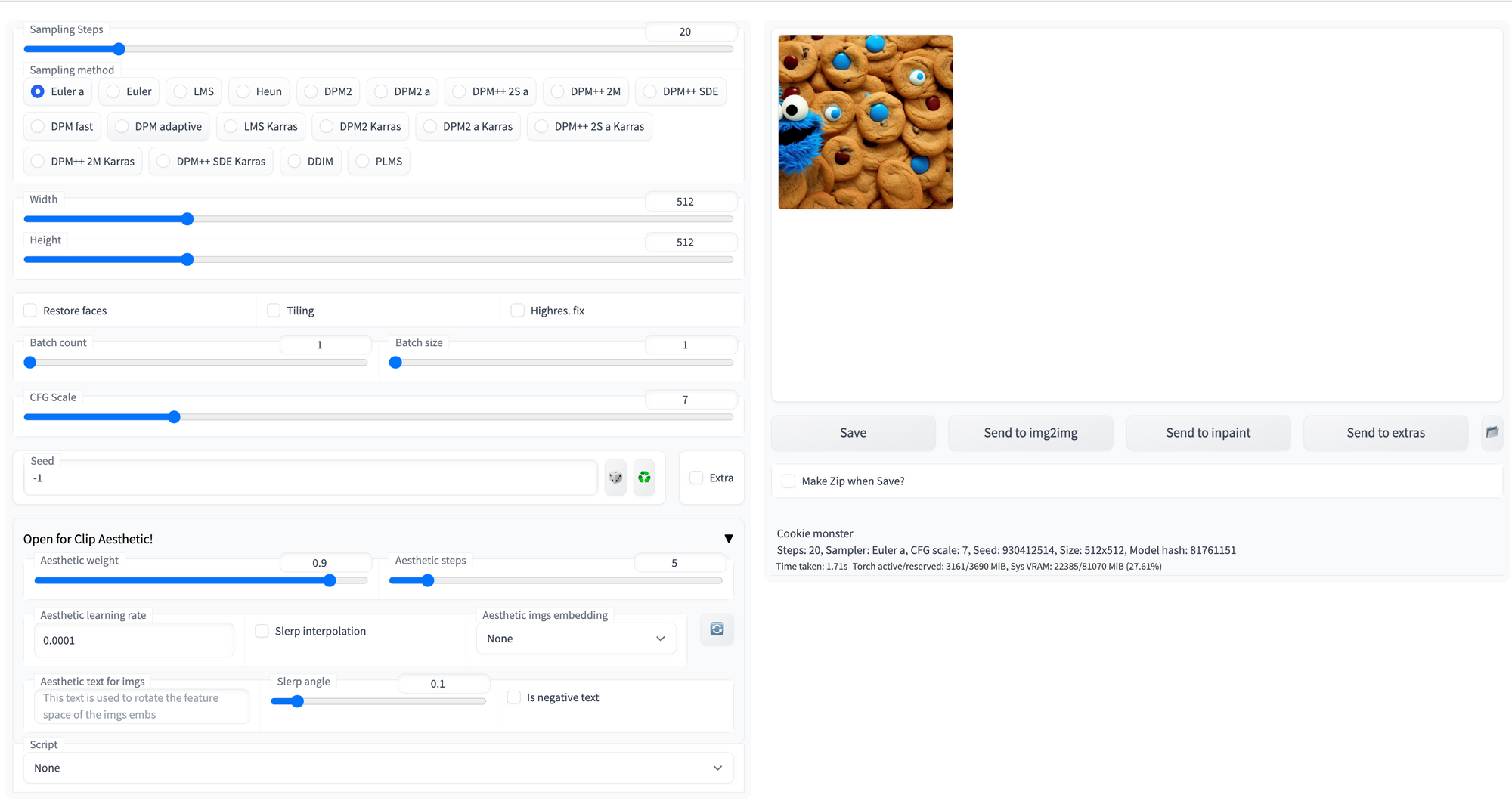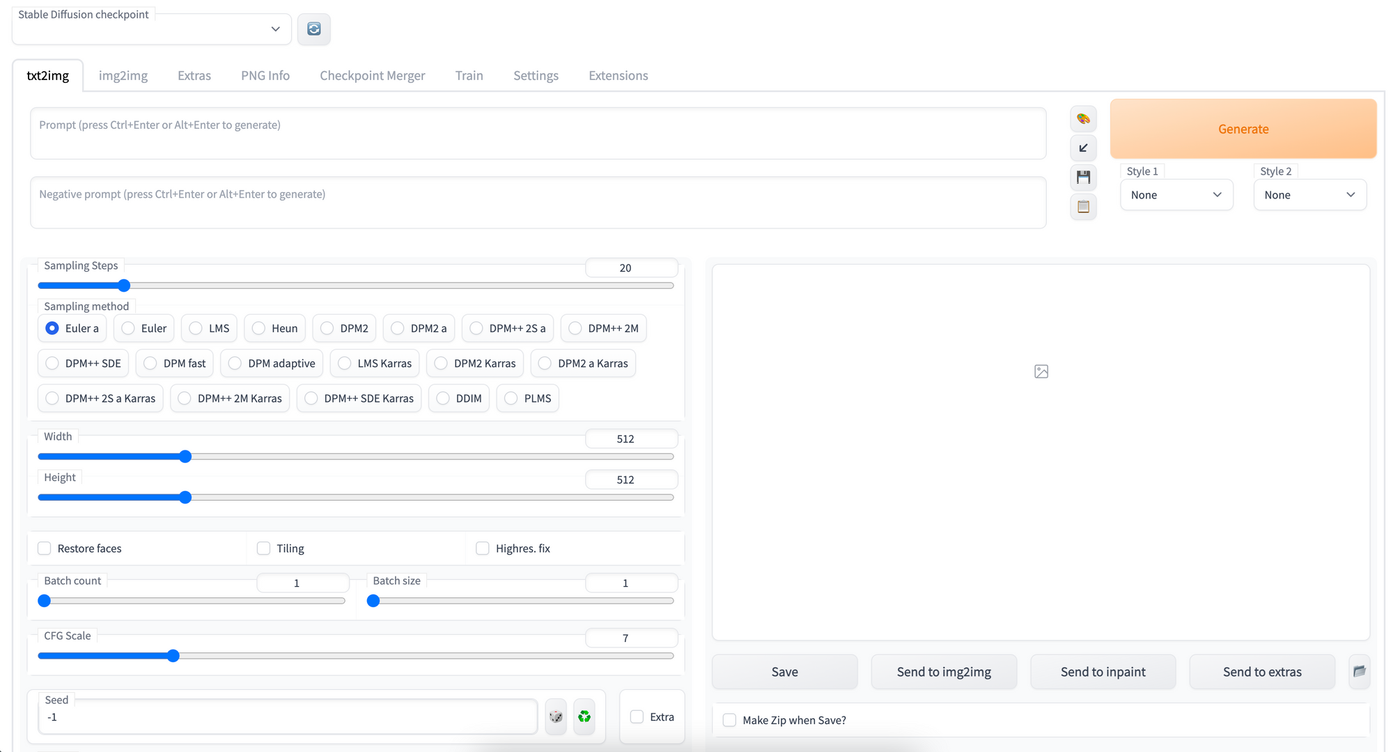 If everything launched successfully, you will be greeted by the txt2img "homepage" of the Stable Diffusion Web UI when you go to the link, and can now get started synthesizing images!