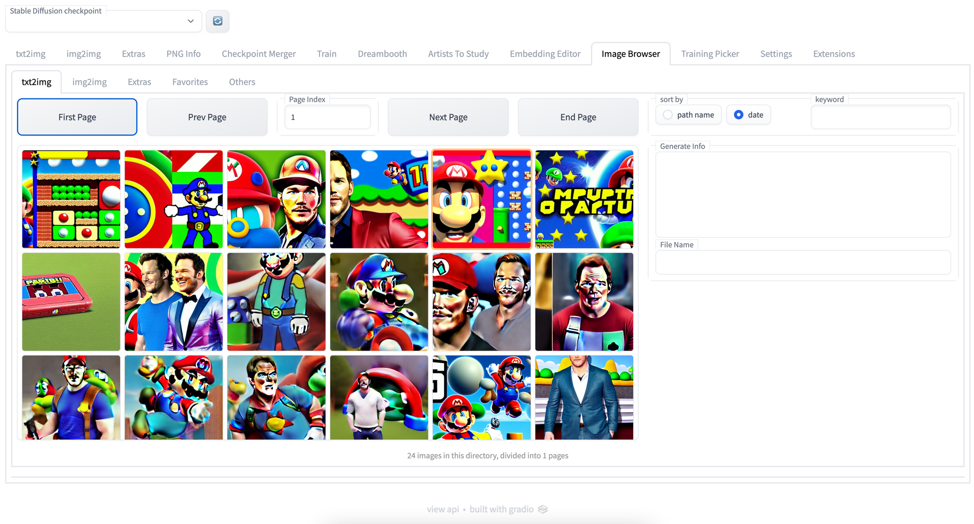 Perhaps the most useful utility extension, the Image Browser add-on allows users to examine the images generated throughout the session from within the Web UI. This is particularly useful to Deployment users, as it provides an easy method to download images generated at any time earlier in the session, and compare photos across different generation specs.