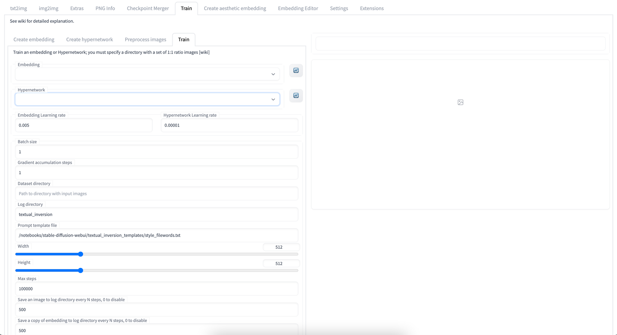 The train tab adds the ability to train hypernetworks and image embeddings within the Web UI using a selection of files. These capabilities are still being updated to match the function of external tools, but they can still be useful especially if we want to train an image embedding on a relatively low-power GPU.