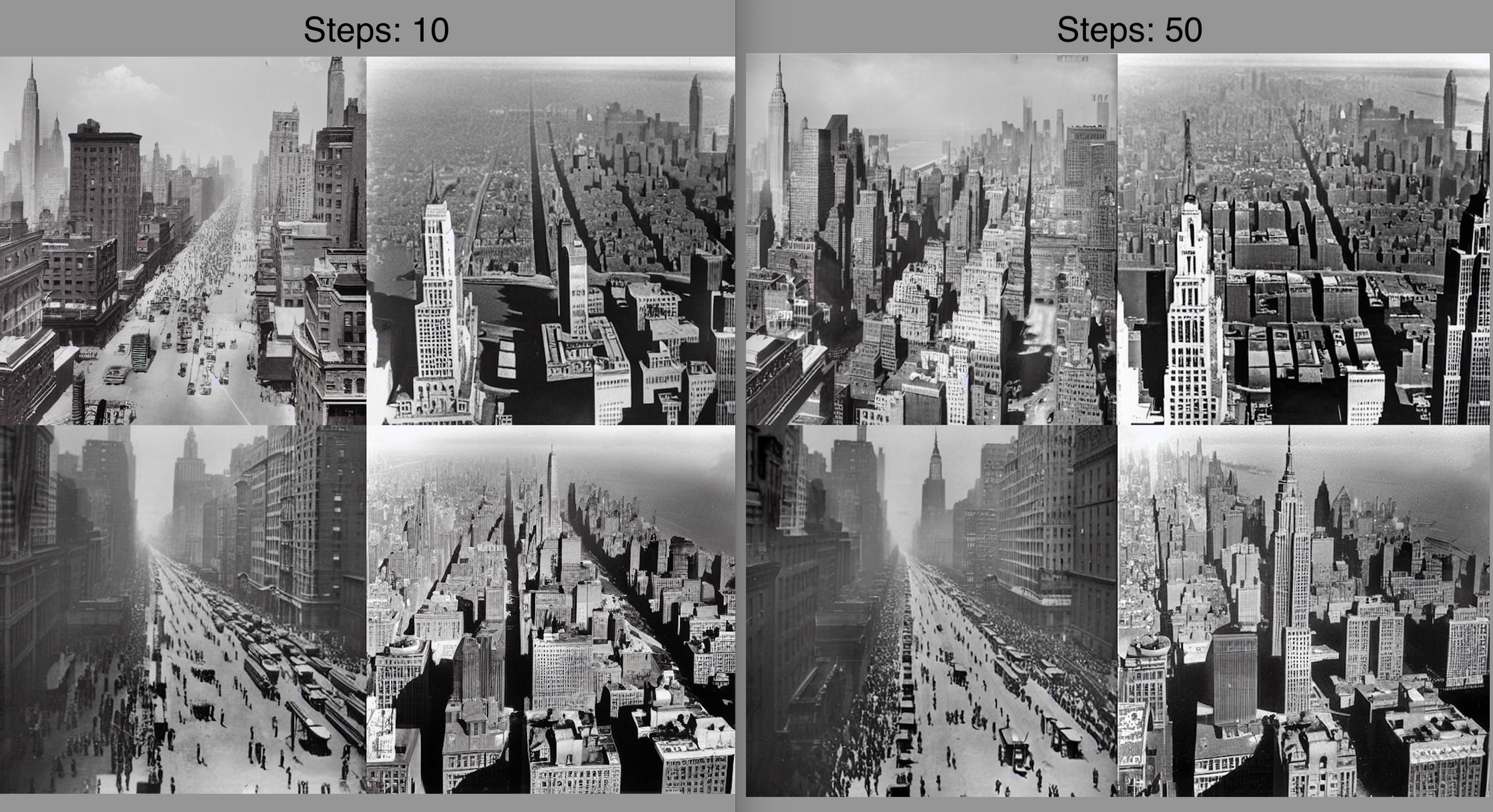 There are a number of new Schedulers added to the Web UI since the last iteration of this deployment container. In particular, we want to call attention to the DPM++ 2M, DPM++ 2M Karras, and DPM++ SDE schedulers. These are all capable of generating high quality outputs at extremely low sampling step values. Above is a sample containing images generated at 10 diffusion steps and 50 diffusion steps. As we can see, there is relatively little loss in graphic fidelity, and the images in the left hand grid are aesthetically nearly identical in terms of detail and definition as the images generated with 5x the amount of steps.