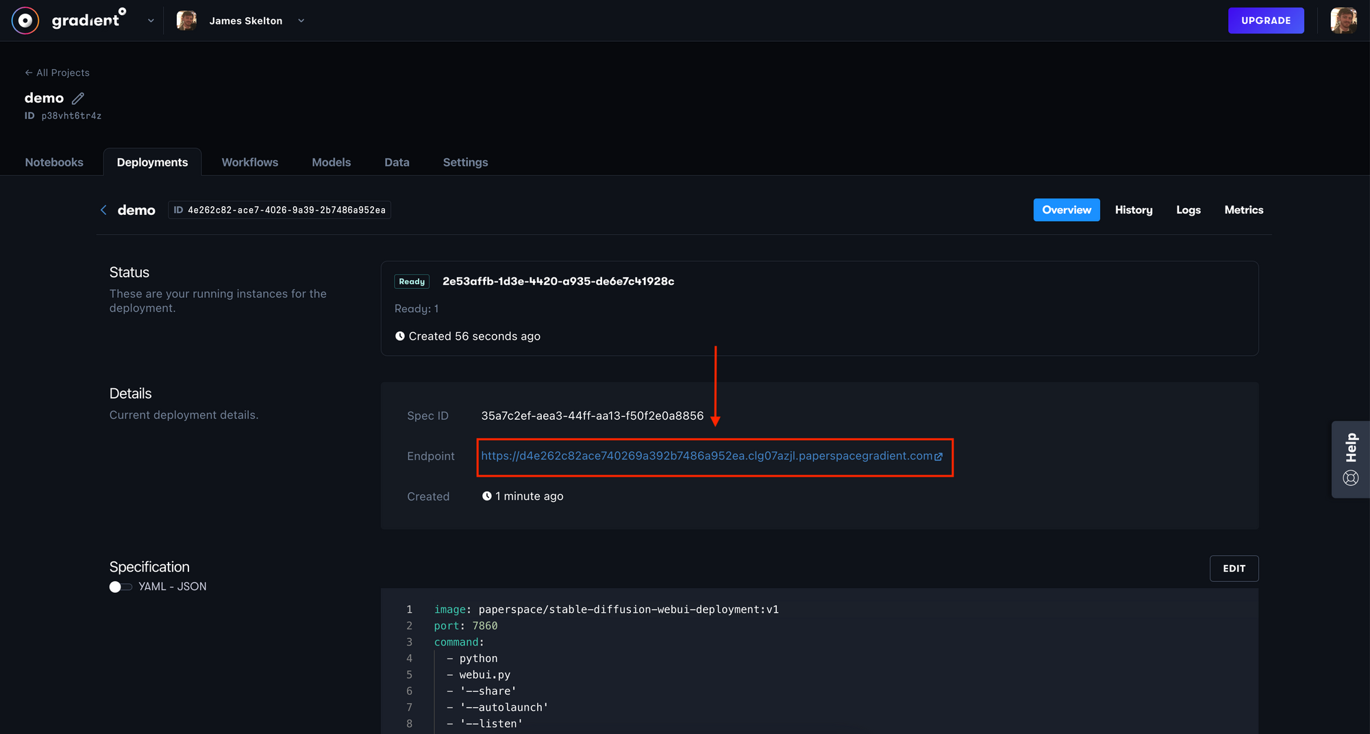 Once you have done so, hit 'Create Deployment' to spin up the machine. This should take about a minute to setup. Once that is done, click on the API endpoint link in your deployment details page to open the web UI.