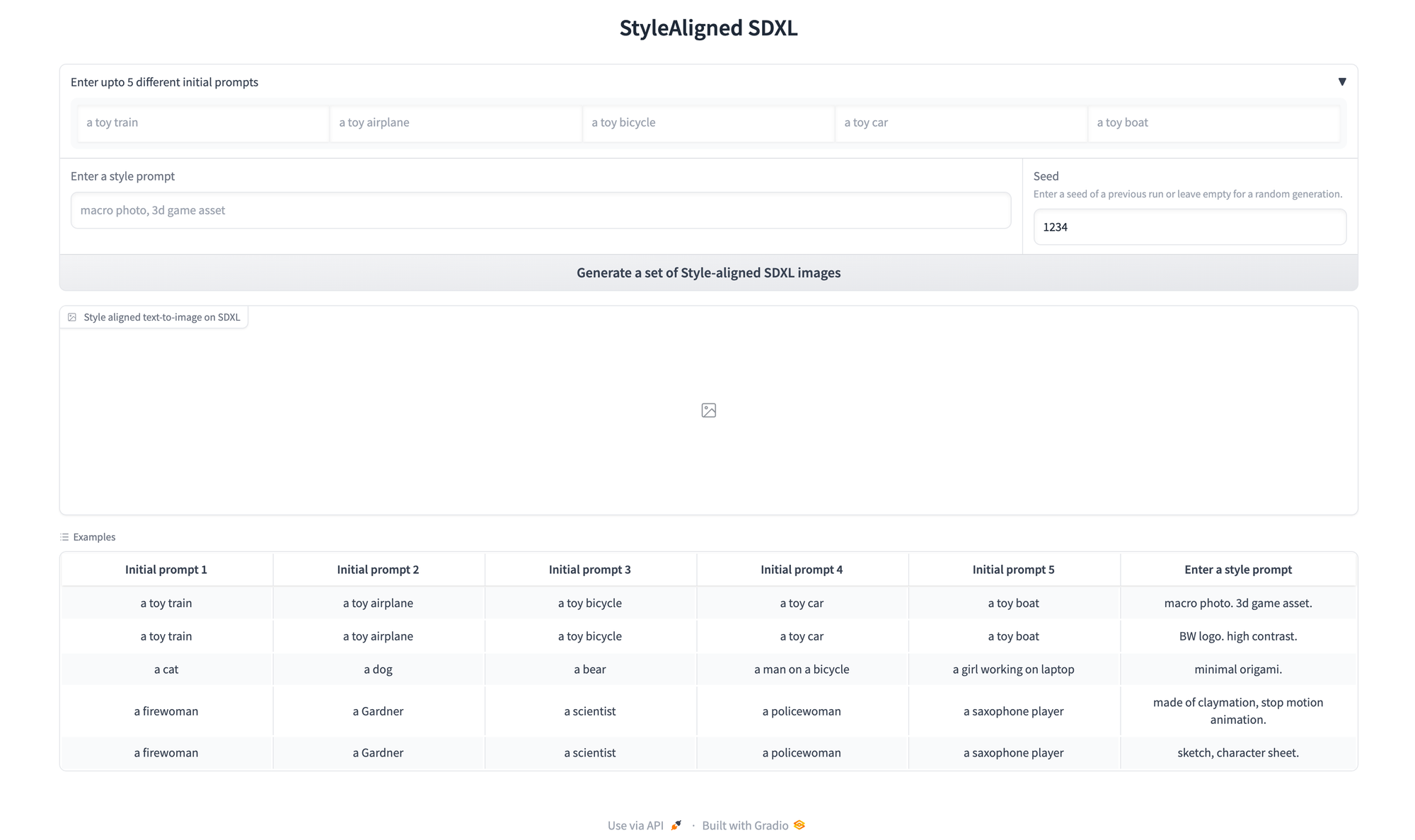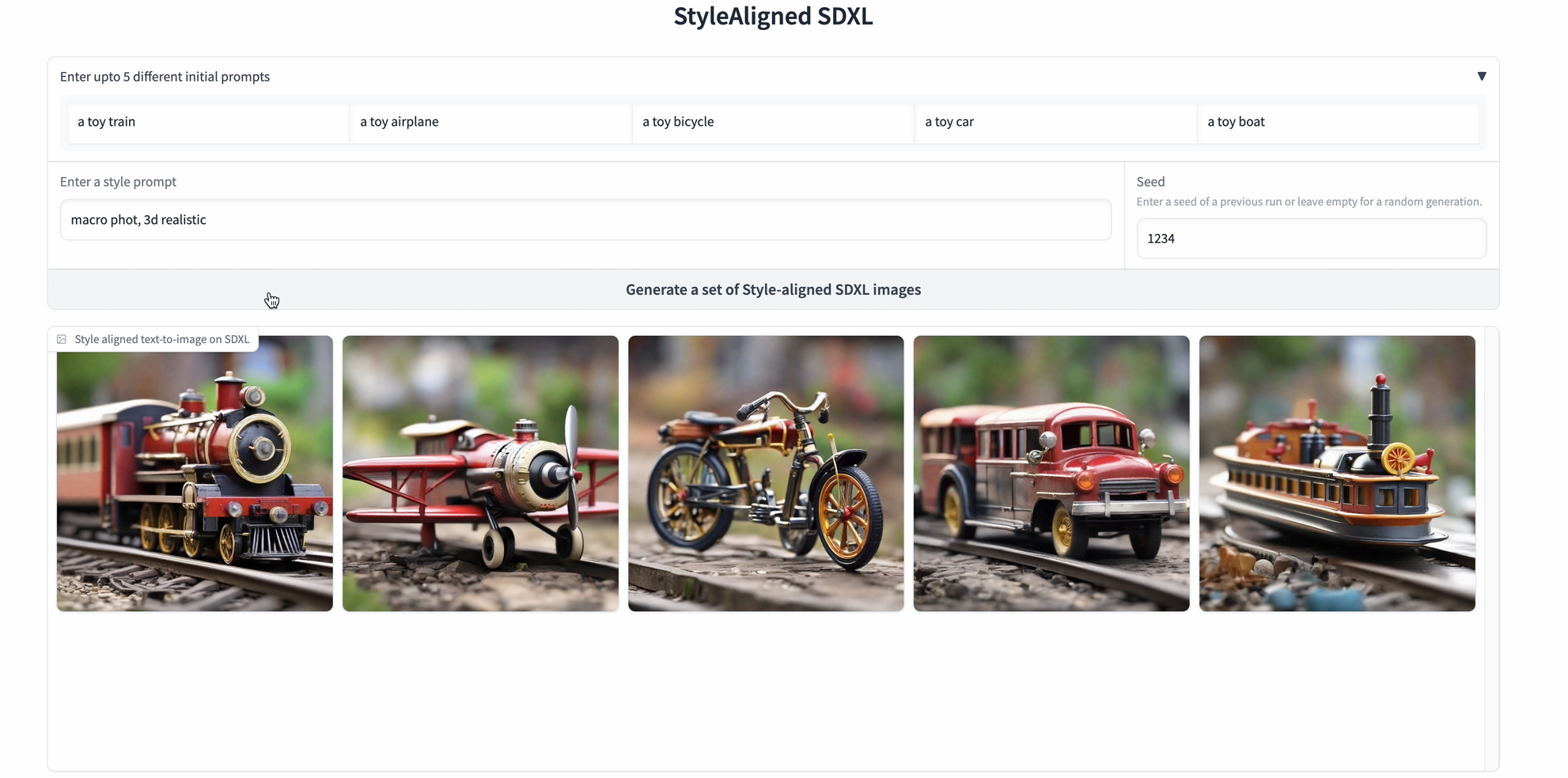 The first thing we can do is to try out some prompts to test the image generations using the StyleAligned SDXL model.