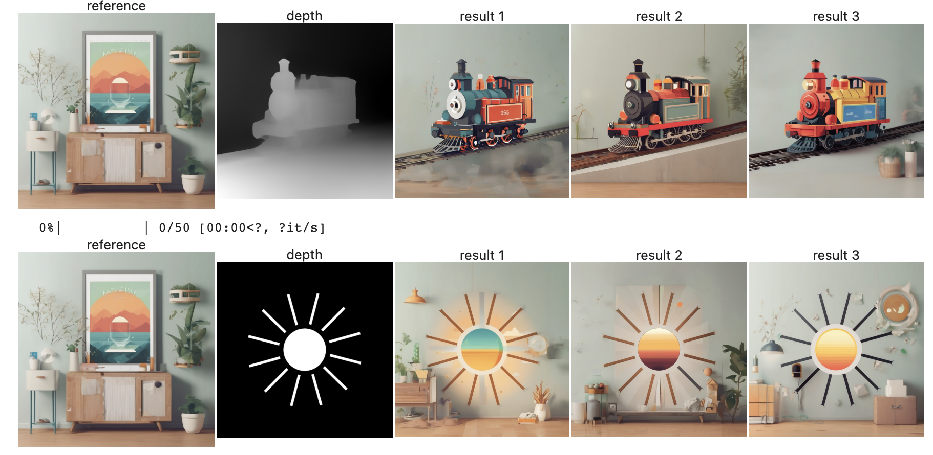 mediapy.show_images([images[0], deph_map] + images[1:], titles=["reference", "depth"] + [f'result {i}' for i in range(1, len(images))])This code block generates images using the ControlNet model conditioned on a reference prompt, target prompts, and depth maps. The results are then visualized using the mediapy library.