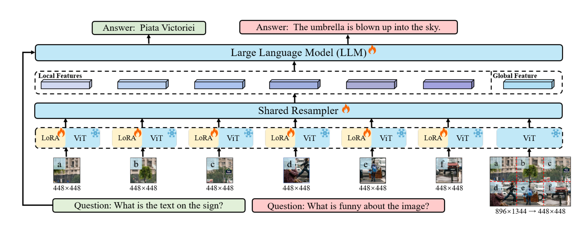 - Concurrent Processing: Both the individual patches and the global image are processed through the visual encoder and resampler simultaneously.