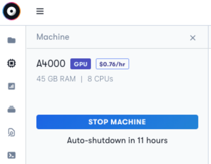 Monkey Output:- The image displays a computer interface with a blue background. The main focus is on a machine with the label "A4000" and the price "$0.76/hr". The machine is equipped with 45 GB RAM and 8 CPUs. There are also several buttons and icons on the interface, including a blue "STOP MACHINE" button and a white "Auto-shutdown in 11 hours" button. The text "45 GB RAM" and "8 CPUs" are also visible. The overall layout suggests a user-friendly interface for managing virtual machines.