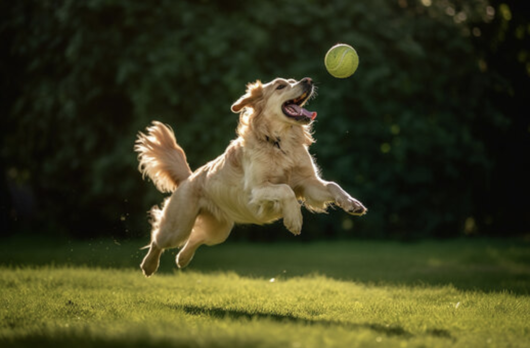 Monkey Output:- In the image, a golden retriever is captured in mid-air, leaping towards a yellow tennis ball that is suspended in the air. The dog's body is stretched out, with its front paws reaching for the ball, and its tail is raised high in excitement. The background is a lush green lawn, providing a stark contrast to the dog's white fur. The image is taken from a low angle, making the dog appear larger and more imposing. The dog's focused expression and the dynamic pose suggest a moment of intense playfulness.