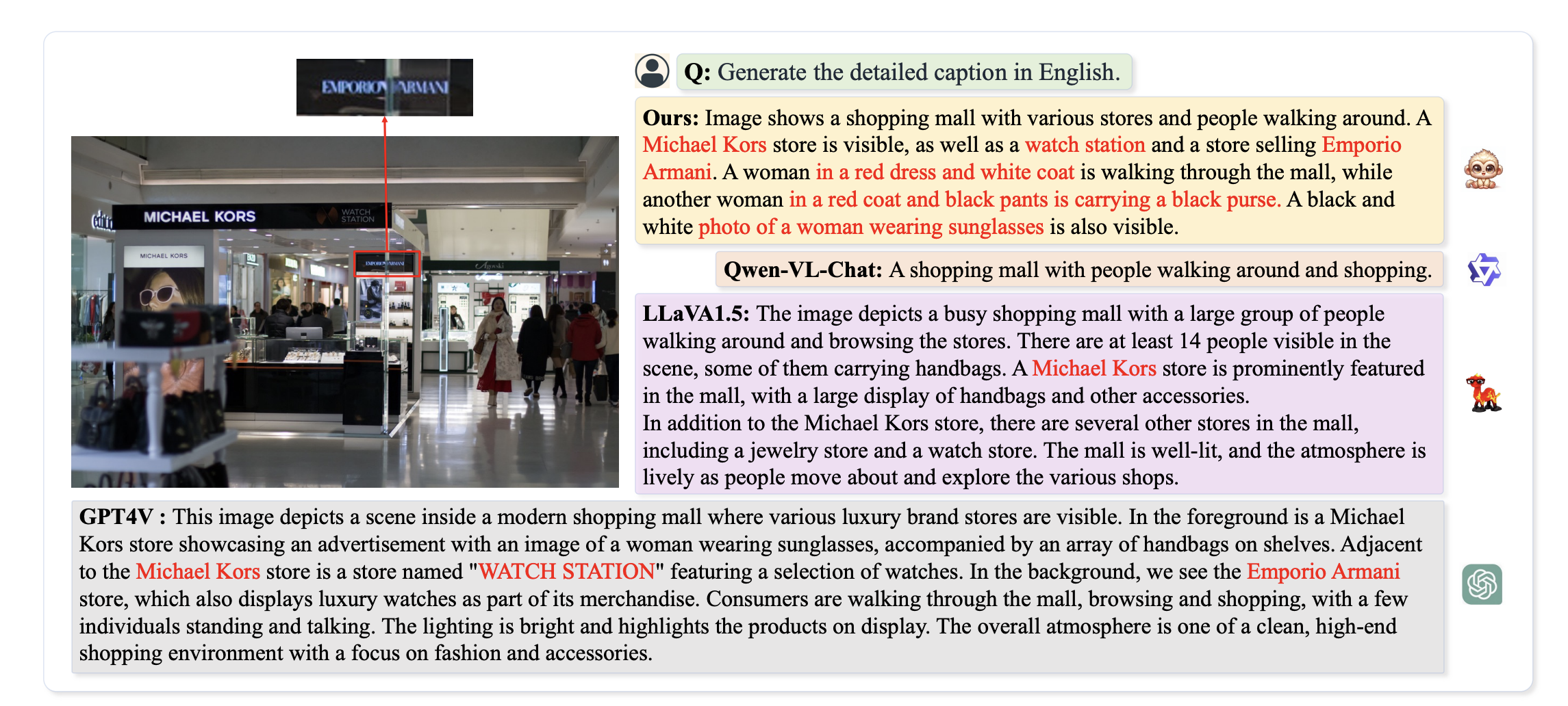 Monkey and GPT-4V identified an "Emporio Armani" store in the background, with Monkey providing additional details, such as a woman in a red coat and black pants carrying a black purse. (Image Source)