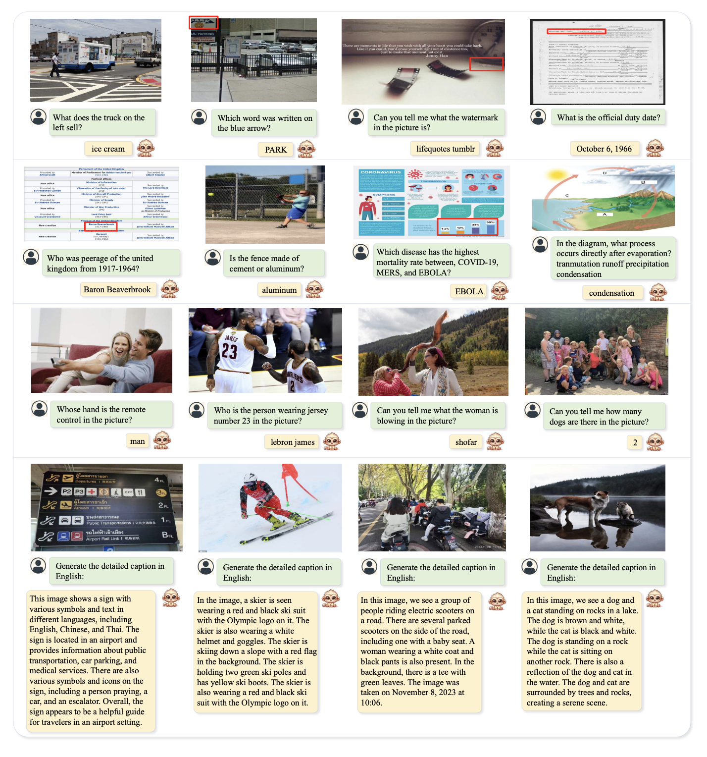 - Performance Enhancements: Shows competitive performance across various tasks, including Image Captioning and Visual Question Answering, demonstrating promising results compared to models like GPT-4V, especially in dense text question answering.