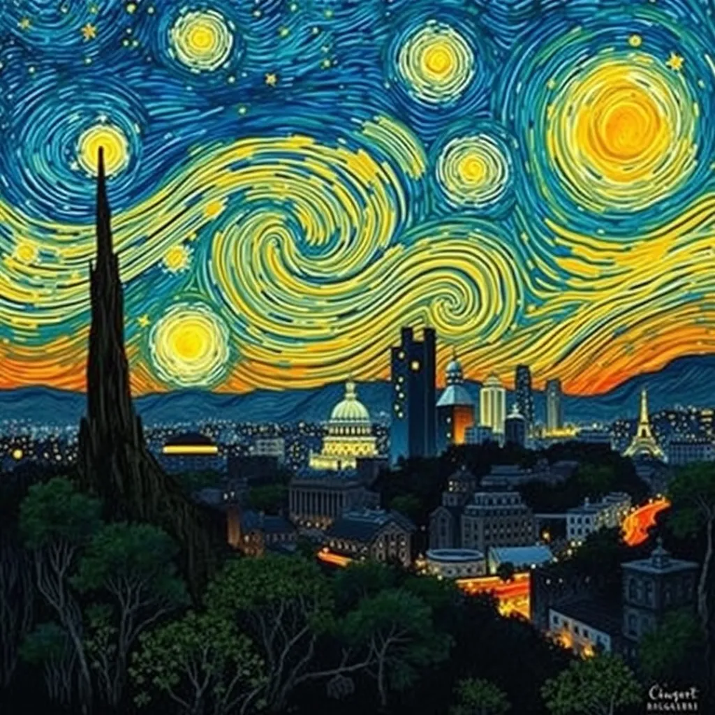 Monkey Output:- This image is a painting of a city skyline at night. The sky is filled with swirling yellow and blue colors, creating a starry effect. In the foreground, there is a tall building with a clock on top. The painting also features a large tree with a yellow light shining on it. The overall effect is one of tranquility and beauty, reminiscent of the famous "Starry Night" painting by Vincent van Gogh.