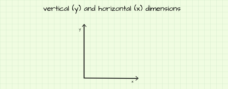 Also known as coordinate or axis, dimension represents a form of reference on a spatial plane (hence the term spatial dimension). Consider a plane sheet of paper propped up to stand on one of its edges such that it faces you. Imagine we are on an arbitrary point on this plane, we would only be able to move vertically (up and down), horizontally (left and right) or some combination of the two (at an angle). Since all of your movement on this plane can be summarized using those two directions, in order to move around in any meaningful way we would need two reference lines, one horizontal called 'x' and the other vertical called 'y' as depicted below. To be more exact, the horizontal reference can be called dimension x and the vertical reference dimension y. Since these two dimensions are enough to describe any movement or figure on this sheet of paper we can say it is a 2-D (2-dimensional) representation.