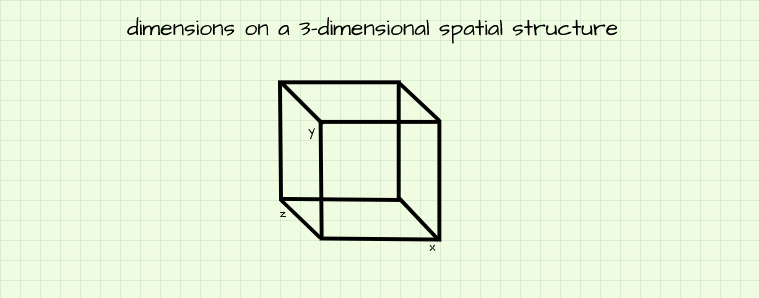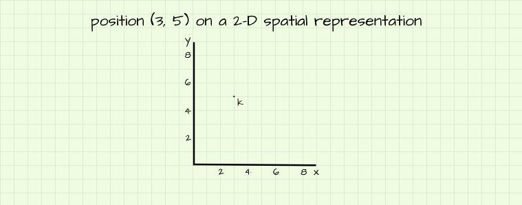 Any point on a spatial plane can be located by making reference to its position on all dimensions present. Consider a point k on a 2-D plane at a position (3, 5), this implies that the point is located 3 units from the origin on the x axis and 5 units from the origin on the y axis. For nomenclature purposes, points in a spatial structure are named (x-position, y-position) if they are present on a 2-D representation and (x-position, y-position, z-position) if they are on 3-D representations.