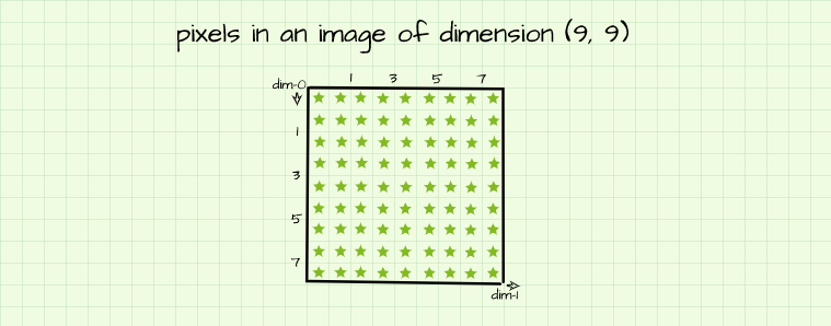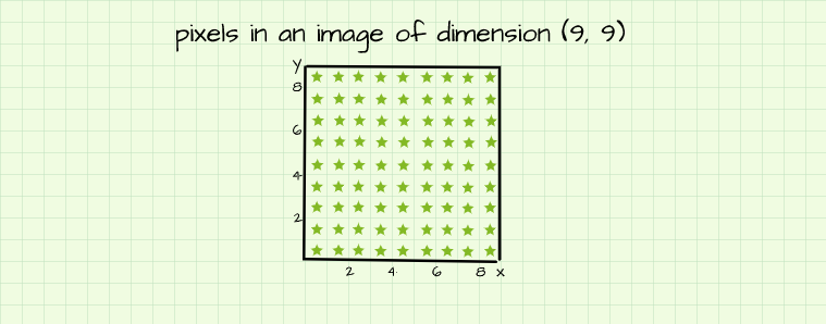 Consider the 2-D plane we used for illustration purposes in the last section. Imagine the axes are closed off to form a square as seen in the image above, it then essentially becomes a grid of 9 columns and 9 rows. When this grid is populated with pixels (depicted by the green stars just for convenience), it becomes an image of 9 rows by 9 columns which implies that there are 9 columns and 9 rows of pixels. In more succinct terms, it becomes a (9, 9) pixel image. To determine the number of total pixels present in this image, we simply multiply the number of units present in both dimension, in this case 9*9 = 81 pixels.