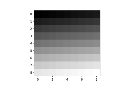 In the code block above, a '1-D array' (actually called a vector) with elements ranging form 0 to 80 is created (so a total of 81 elements). Next, the vector is reshaped into a (9, 9) array and then visualized. Evidently, since the pixels (elements) in the array increase from o to 80, pixel intensities increase progressively from dimmest to brightest, so in fact the pixel intensity theory does prove true.