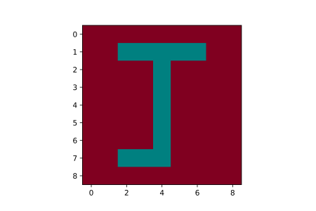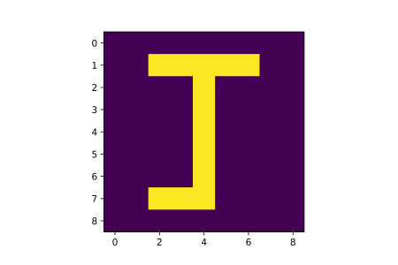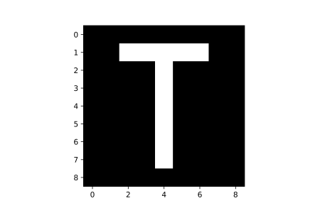 One could also explicitly change the value of pixels in an image by indexing and assigning them new values. For instance, let's assume we would like to generate a figure 'T' from our figure 'J'. Its a matter of simply canceling out the tail of the 'J' which is formed by pixels on row 7, columns 2 & 3. We can do this by indexing those pixels and assigning them a value of zero so they have no intensity.