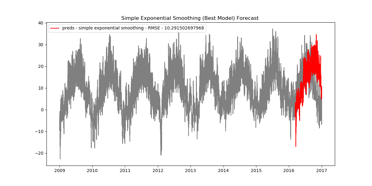 As it turns out, the simple exponential model has the smallest RMSE value, thus making it the best model we have.