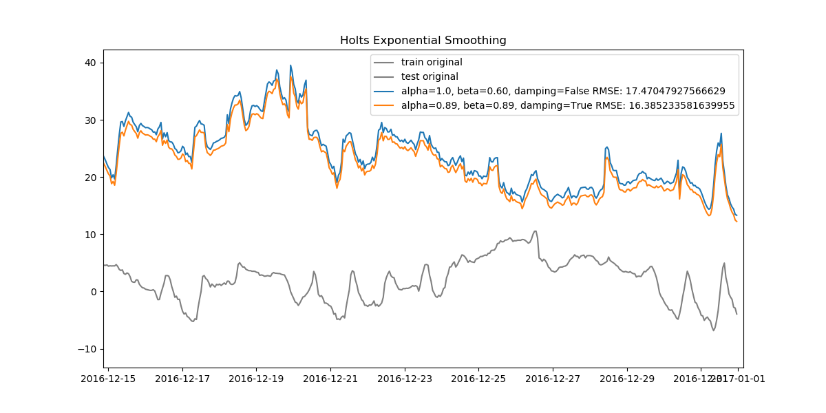 label="alpha="+str(f.params['smoothing_level'])[:4]+", beta="+str(f.params['smoothing_trend'])[:4]+ ", damping="+str(True if f.params['damping_trend']>0 else False)+" RMSE: "+str(r),
