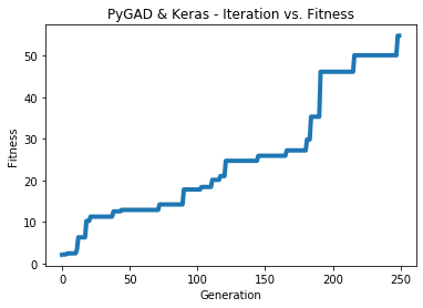ga_instance.plot_result(title="PyGAD & Keras - Iteration vs. Fitness", linewidth=4)Statistics About The Trained Model