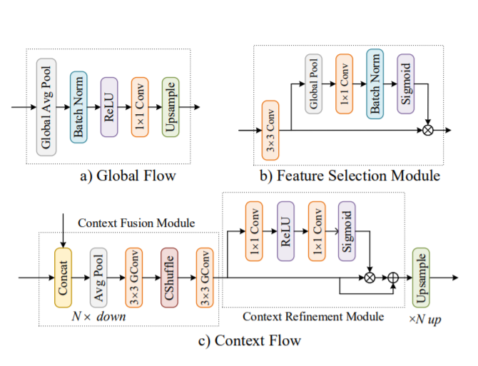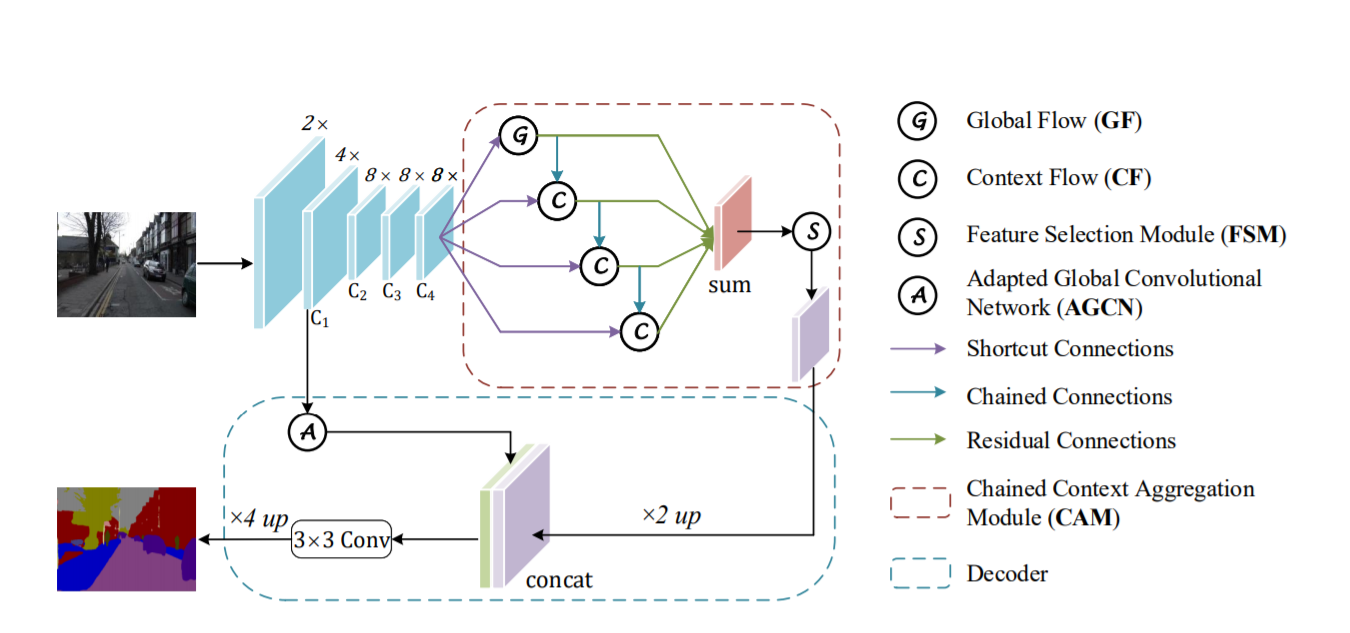 The Chained Context Aggregation Module (CAM) is one of the most critical aspects of the CANet architecture, as discussed previously. It consists of both the global flow and the context flow. Both of these structures are shallow encoder-decoder structures containing a down-sampling layer to gain different receptive fields, a projection layer to integrate sufficient context features, and an up-sampling layer to recover localization information.