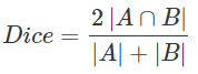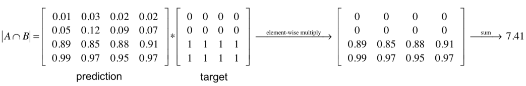 For the case of evaluating a Dice coefficient on predicted segmentation masks, we can approximate $|A∩B|$ as the element-wise multiplication between the prediction and target mask and then sum the resulting matrix. This loss function helps us to determine how much loss is encountered in each pixel and how accurate our model is performing per pixel. Then the overall sum can be taken to show the complete loss from a target model to the predicted model after segmentation is performed.
