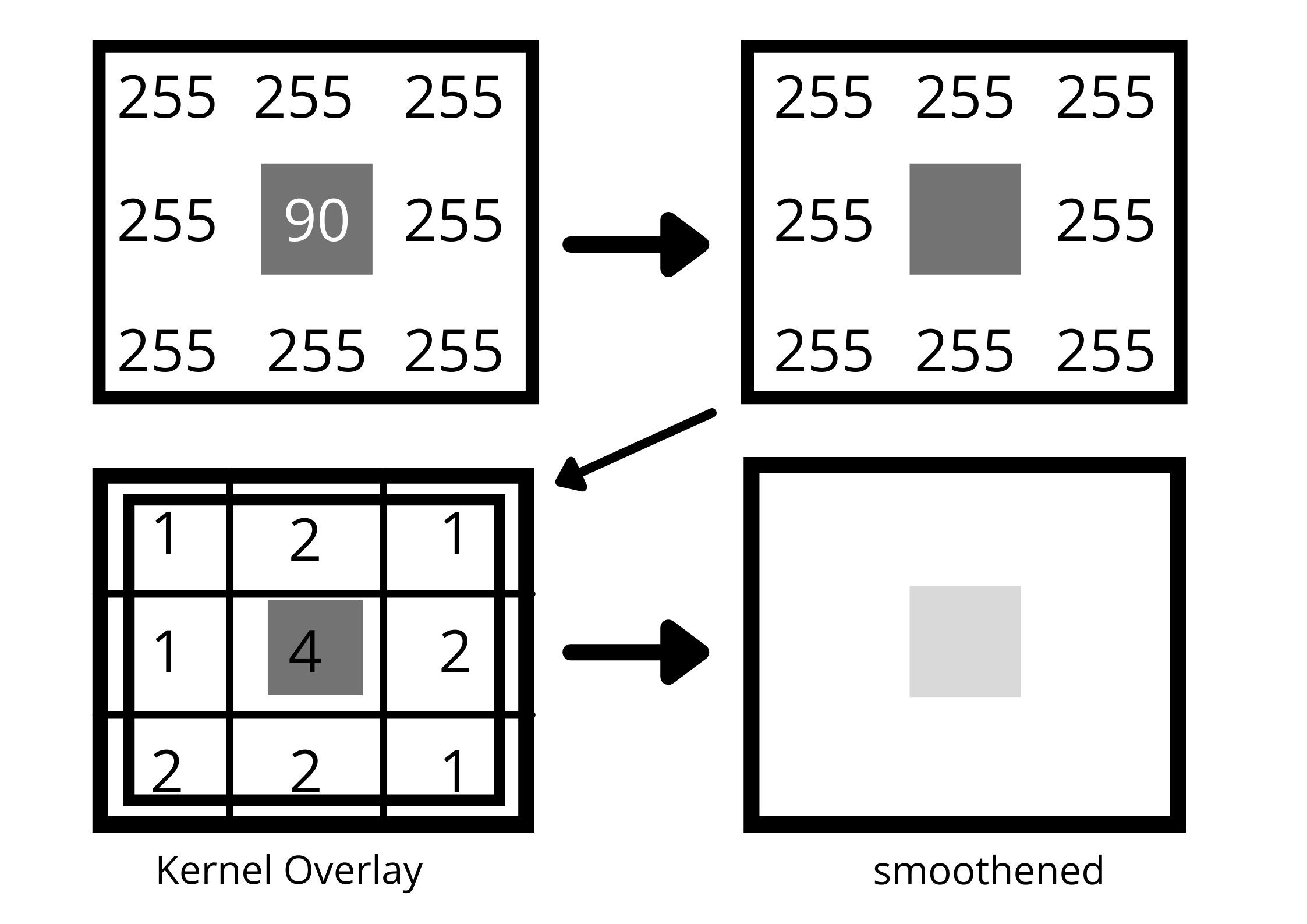 Averaging of pixels to reduce noise will be done with a kernel. This kernel window of normally distributed numbers is run across our entire image and sets each pixel value equal to the weighted average of its neighboring pixel, thus smoothening our image.