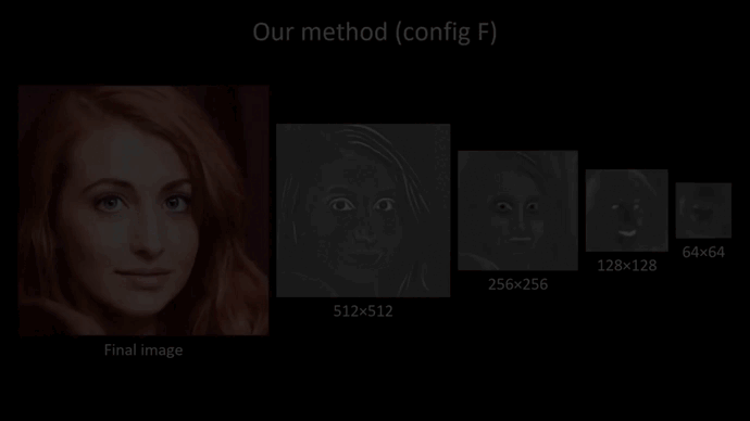 The authors noticed that, as they scale up the images that walk along the latent space, some kind of features such as mounts and eyes (if we generate faces) are sort of fixed in place. They attribute this to the structure of the progressive growing, and having these intermediate scales and needs intermediate low-resolution maps that have to be used to produce images that fool a discriminator. In the figure below, we can see some examples of that.