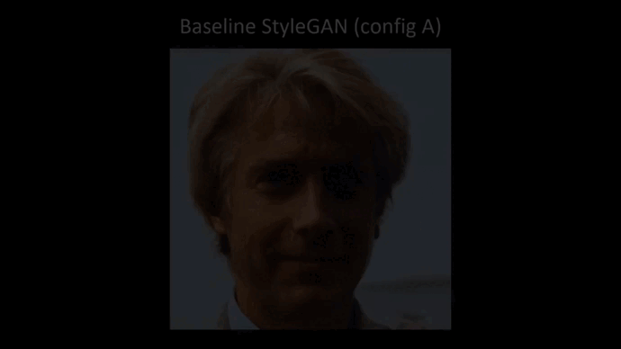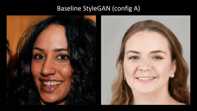 In the figure below you can see a gif extracted from the video released with the paper that shows examples of the droplet artifacts; the authors identify the cause of these artifacts to the way that the adaptive instance normalization layer is structured. It is interesting when they see that the artifacts start from 64 by 64 resolution scale and then persist all the way up to 1024 by 1024 scale.