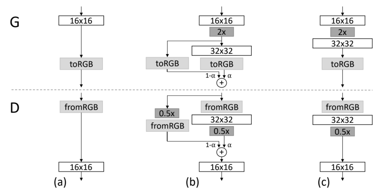 The last change in StyleGAN2 described in the paper is to eliminate the progressive growing. In progressive growing, when the network finished generating images with resolution of some arbitrary size like 16 by 16, they add a new layer to generate a double size images resolution. They up sample the previously generated image up to 32 by 32, and then they use the formula below [(1−α)×UpsampledLayer+(α)×ConvLayer] to get the upscaled image.