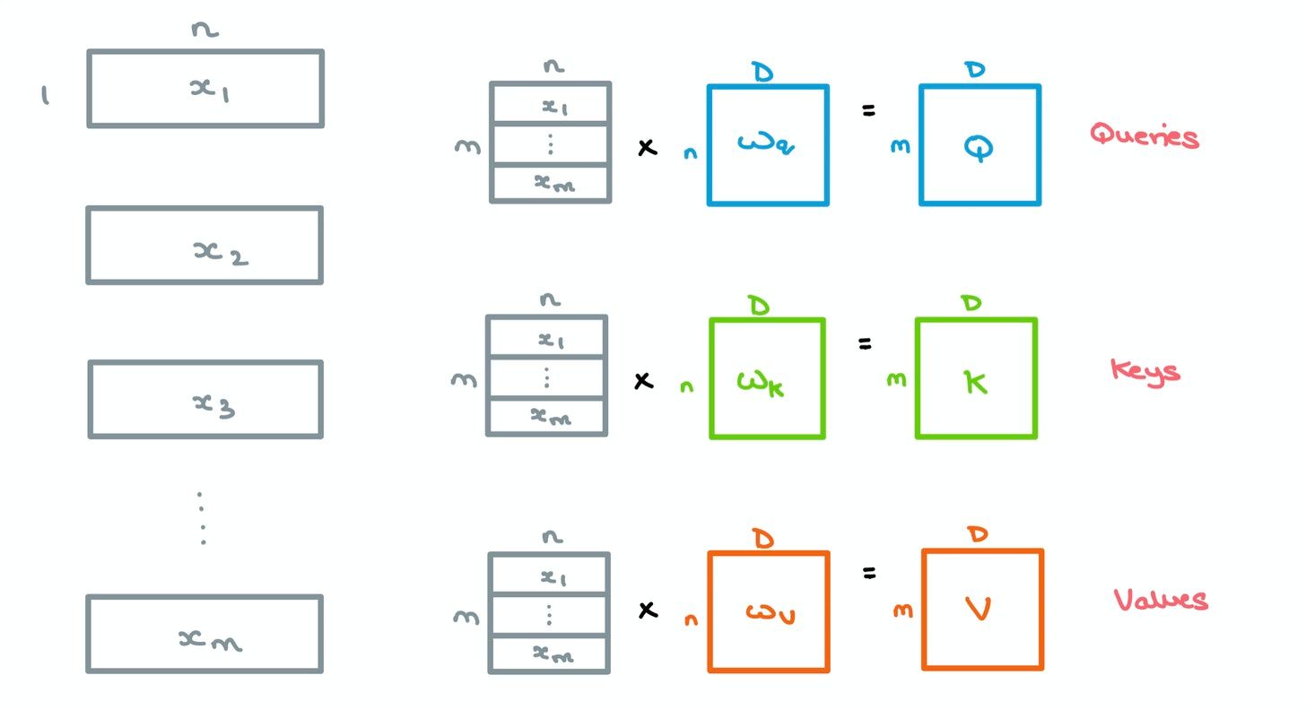 - For a given sequence, the $m$ incoming word vectors of length $n$ are stacked and multiplied by an initial set of weights $W_q$, $W_k$, and $W_v$, of dimensions $n \times D$ – this gives us 3 matrices, queries $Q$, keys $K$, and values $V$, of size $m \times D$. Here, $D$ is the embedding dimension used throughout the Transformer.